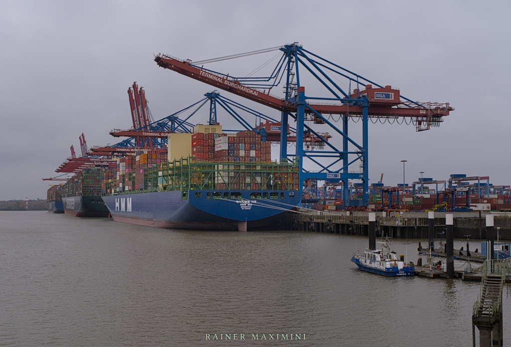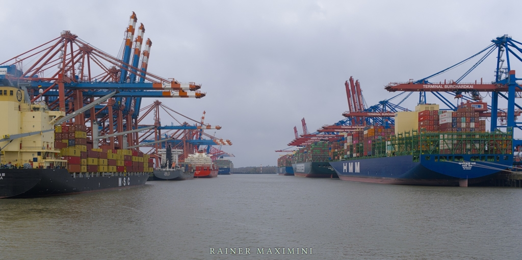 Am Ende des Waltershofer Hafens sieht die man Pfeiler der Köhlbrandbrücke, welche ebenfalls abgerissen werden soll. Die Abrissarbeiten werden aber erst Ende 2033 beginnen, zum Fotografieren ist also noch etwas Zeit. Neben dem maroden Zustand ist ihre geringe Höhe ein Problem für die heutigen Großcontainerschiffe. Auf dem Bild sind auf der linken Seite am CTB die Containerschiffe HMM ALGERCIRAS, EVER GRADE und HMM MIR zu sehen und auf der rechten Seite am CTH die Containerschiffe CMA CGM JACQUES SAADE, POLAR CHILE, AVA D und MSC SAMIRA III.