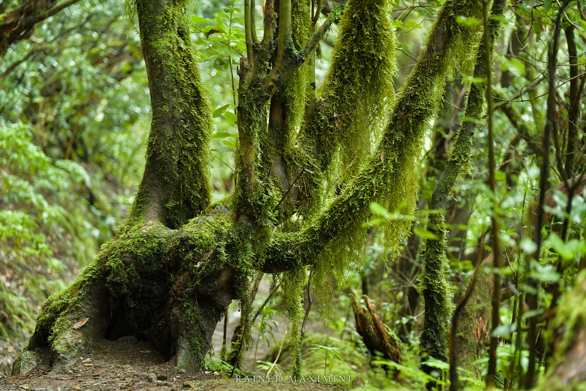 Gut gestärkt von der Mittagsrast am Mirador Pico del Inglés geht es wieder hinab in den Lorbeerwald des Anagagebirges bzw. des Parque Rual de Anaga. Aufgrund der Höhe liegen die Wälder vormittags fast immer in den Wolken. Die Flechten filtern dabei das Wasser aus den Wolken, so dass die Lorbeerbäume von Moosen überzogen sind und alles in einem leuchtenden Grün erstrahlt.