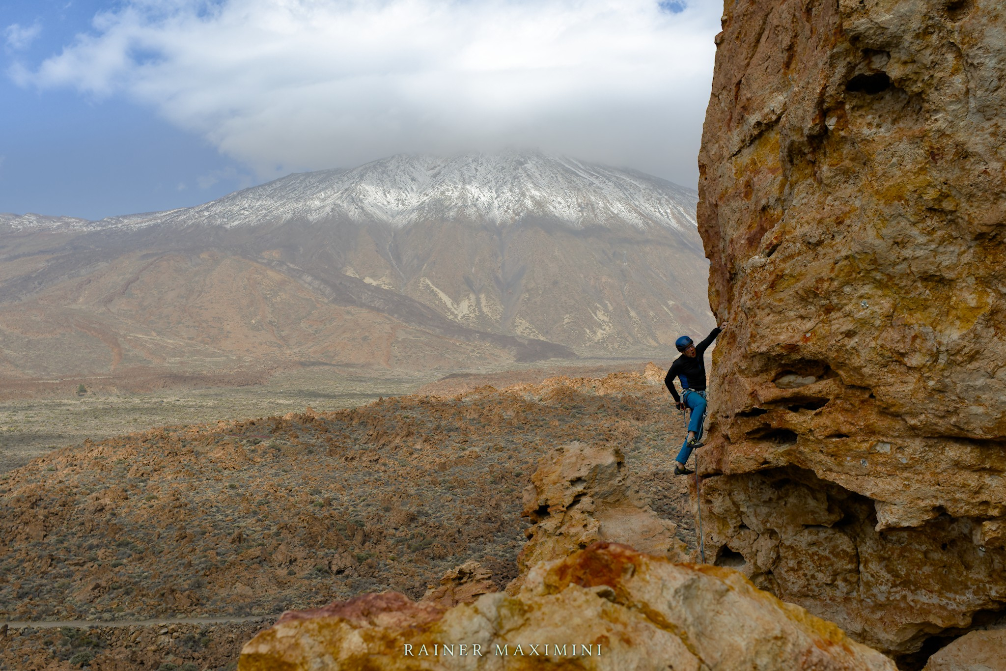 Klettern in El Capricho, in den Cañadas del Teide ist immer wieder ein Erlebnis. Mit dem Teide im Hintergrund entstehen ganz besonders interessante Bilder. Beeindruckend sind immer wieder die Bilder vom Klettern der Route Bodo im Sektor Fraggel Rock. Auf den folgenden Bildern sieht man Marc bei seiner Onsight Begehung der Bodo. Die Route ist zwar nur mit 6a bewertet, durch den überhängenden Einstieg ist sie aber trotzdem cool zu klettern.