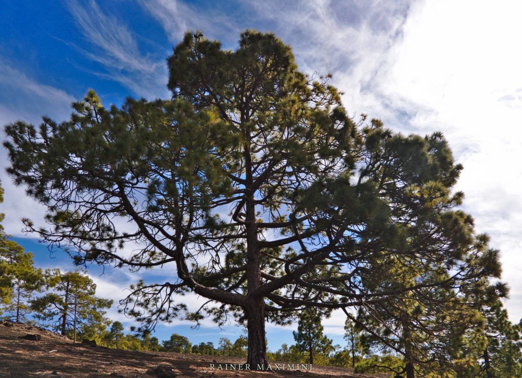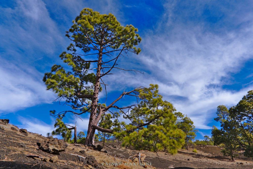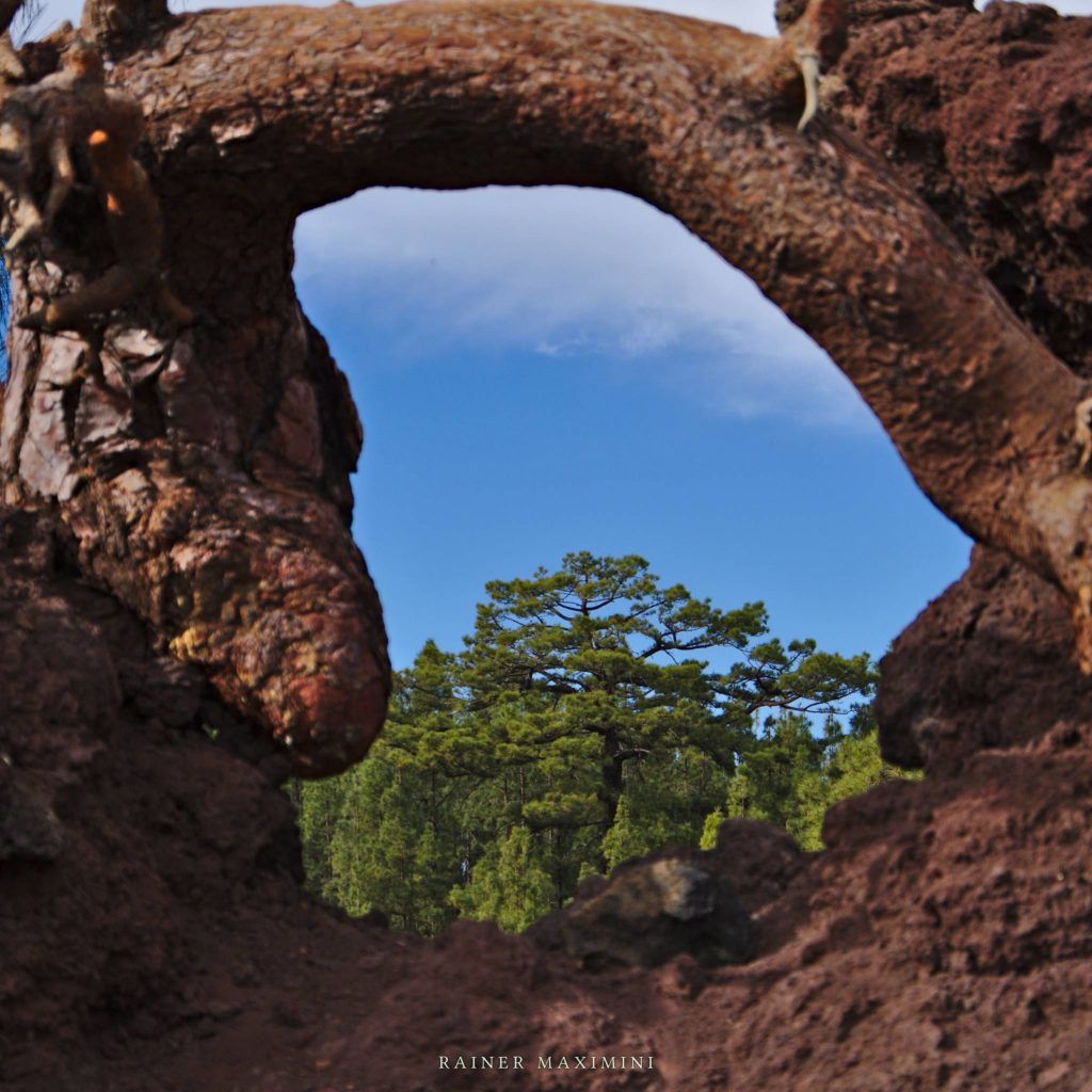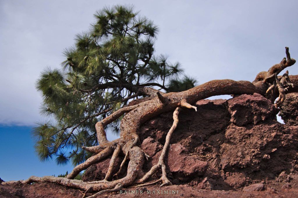 Diesen schief wachsenden Baum mit seinen bizarren Wurzeln haben wir an einem bereits wieder etwas tiefer liegenden Aussichtspunkt entdeckt. Meist wird von hier aus der Blick ins Tal und auf La Gomera fotografiert; uns faszinierte der Baum als Fotomotiv aber viel mehr.