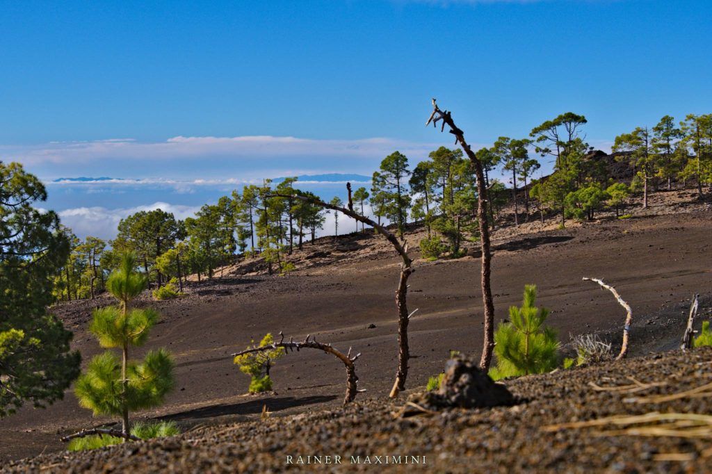 Der Rückweg Richtung Westen über Chio ist landschaftlich mindestens genauso sehenswert wie die Cañadas selbst. Nicht umsonst gibt es hier unzählige Wanderwege und teils stark frequentierte Aussichtspunkte. Wer sich die Mühe macht etwas abseits der offiziellen Wege zu gehen und die Einsamkeit und Ruhe mag wird von einer wunderschönen Steinlandschaft belohnt, die immer wieder den Blick auf La Gomera eröffnet.